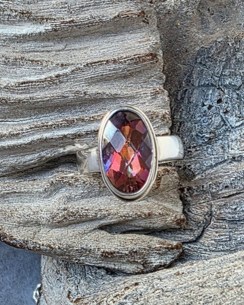 Bold color meets timeless craftsmanship in this stunning Raspberry Topaz Ring. The 8mm by 14mm hand‑cut checkerboard stone catches the light from every angle, creating a vibrant sparkle that feels playful, confident, and unmistakably feminine. Its rich raspberry hue brings a burst of joyful color — the kind that brightens your day the moment you slip it on.